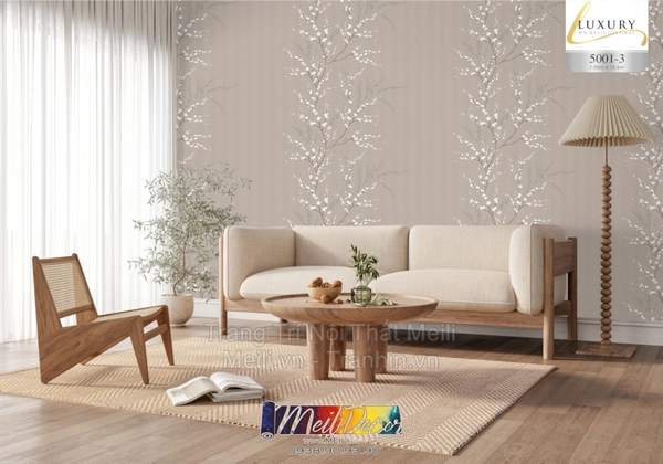 Giấy Dán Tường Việt Nam LUXURY 2025 5001-3 lý tưởng cho phòng trà, phòng ngủ, homestay phong cách tự nhiên. Với diện tường lớn, nên dùng ở bức nhấn (feature wall) để tăng chiều sâu;