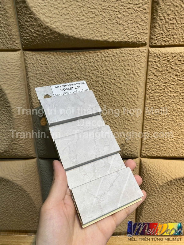 Meili Decor mang đến Tấm Ốp Lam 3 Sóng Thấp GD Gold House L06 chính hãng, chất lượng vượt trội. Chúng tôi còn cung cấp dịch vụ thi công chuyên nghiệp, giúp khách hàng sở hữu không gian sống sang trọng, tinh tế và bền đẹp theo thời gian.