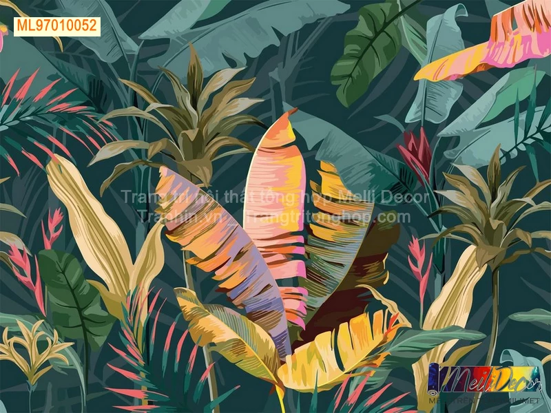 Tranh Tropical thường sử dụng gam màu xanh lá, vàng nắng, hồng pastel và xanh ngọc, tạo nên cảm giác tươi trẻ nhưng không kém phần sang trọng. Những hình ảnh lá cọ, chuối rừng, chim nhiệt đới hay hoa nhiệt đới được thể hiện mềm mại, tự nhiên, giúp không gian trở nên sống động và gần gũi hơn bao giờ hết.