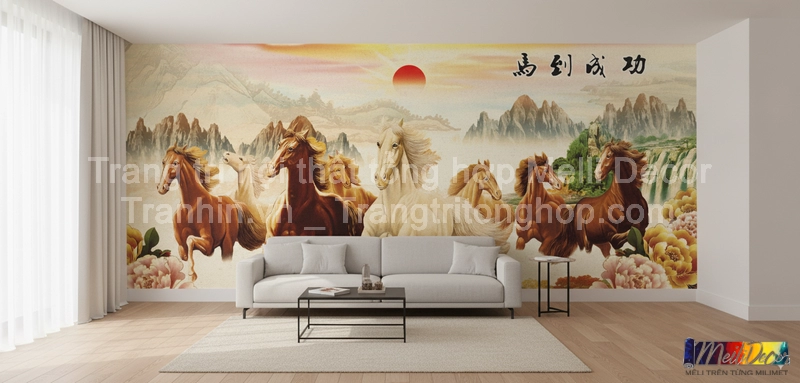 Tranh Dán Tường Phòng Khách Mã Đáo Thành Công là lựa chọn hoàn hảo cho những ai yêu thích phong thủy và mong cầu tài lộc, thăng tiến. Hình ảnh tám chú ngựa phi nước đại biểu trưng cho sức mạnh, ý chí và thành công rực rỡ trong công việc cũng như cuộc sống.