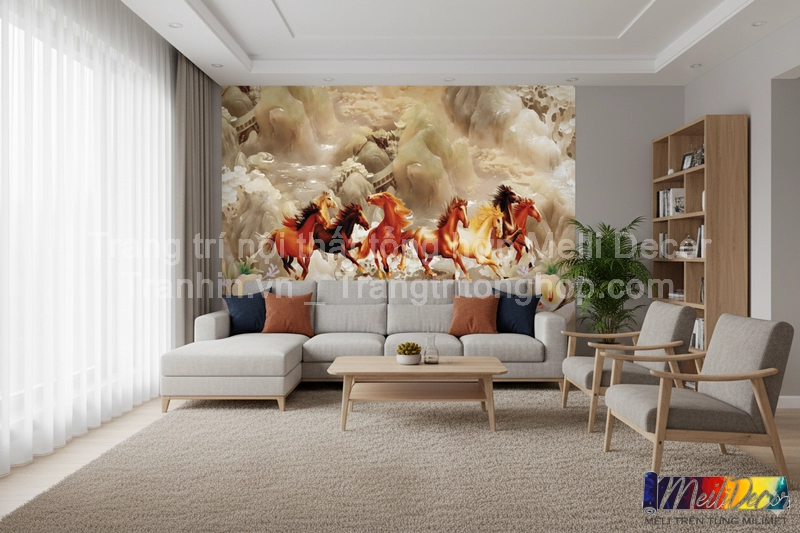 Tranh dán tường phòng khách Mã Đáo Thành Công không chỉ mang giá trị nghệ thuật mà còn chứa đựng ý nghĩa tinh thần sâu sắc, trở thành điểm nhấn phong thủy cho không gian sống.