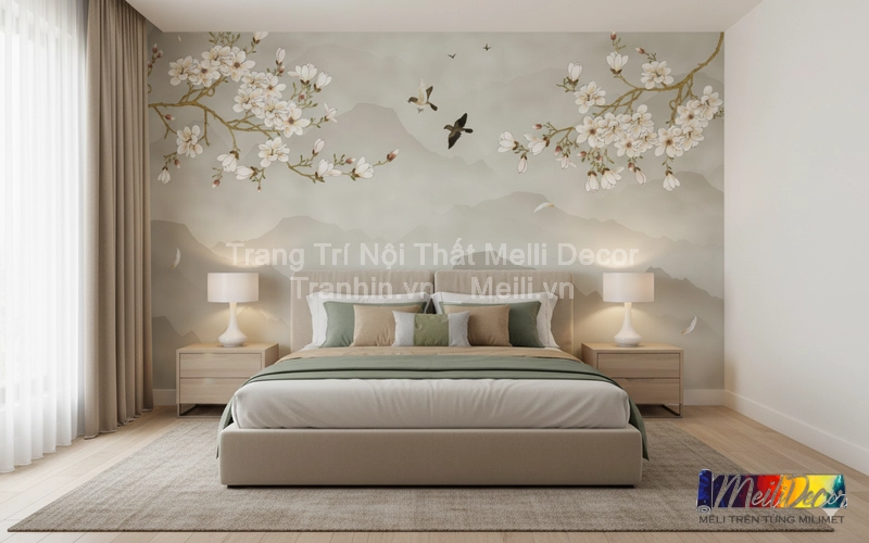 Tranh dán tường Indochine thường sử dụng các họa tiết đặc trưng như hoa lá nhiệt đới, phong cảnh Đông Dương hay các đường nét kiến trúc cổ. Những chi tiết này được thể hiện tinh xảo, tạo chiều sâu nghệ thuật, giúp phòng ngủ trở nên ấm áp và đầy cảm hứng.
