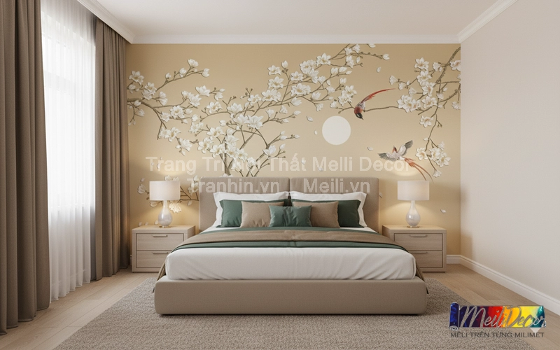 Tranh dán tường Indochine thường sử dụng các họa tiết đặc trưng như hoa lá nhiệt đới, phong cảnh Đông Dương hay các đường nét kiến trúc cổ. Những chi tiết này được thể hiện tinh xảo, tạo chiều sâu nghệ thuật, giúp phòng ngủ trở nên ấm áp và đầy cảm hứng.